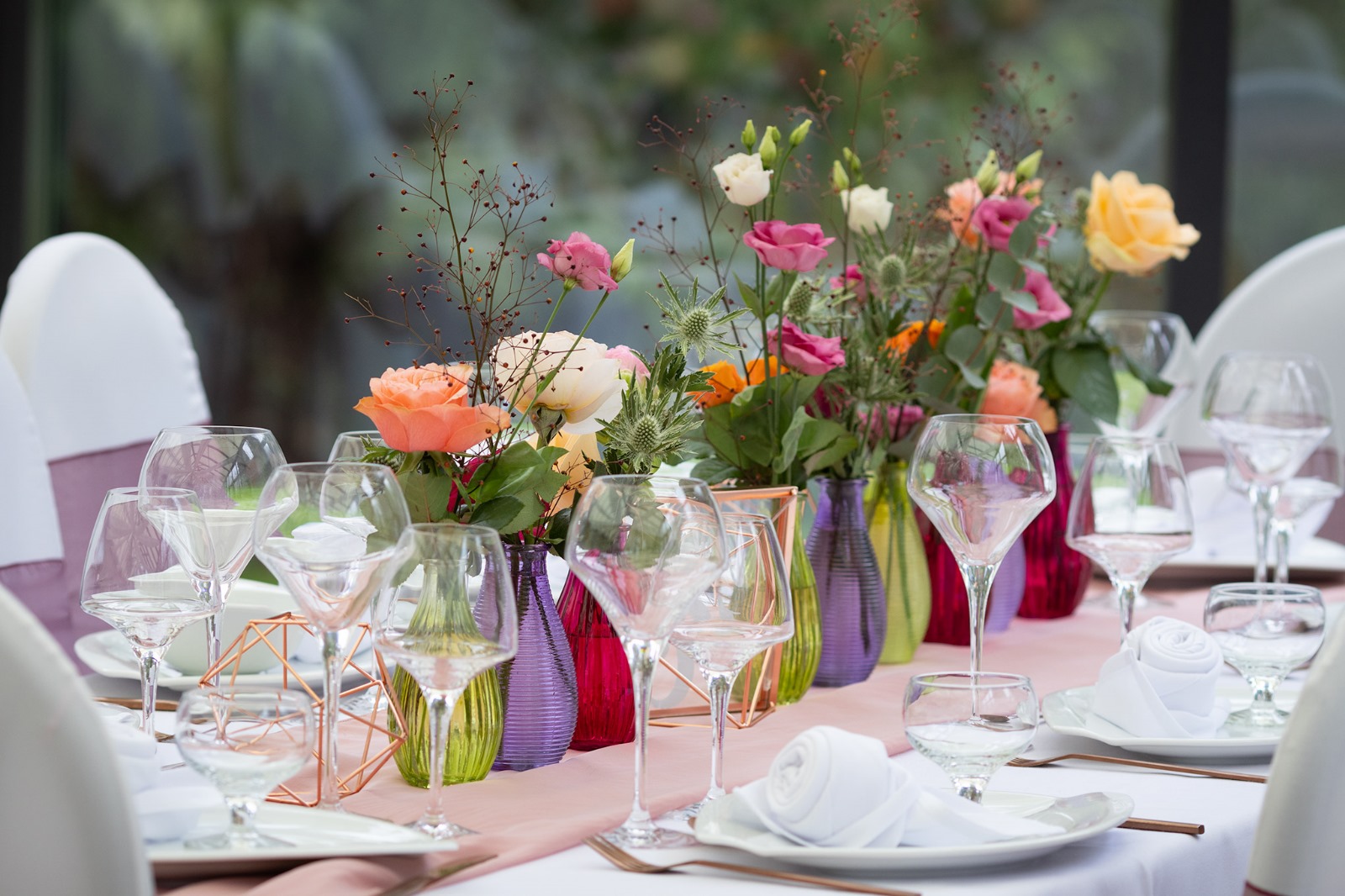 Les vases colorés ajoutent une touche vibrante et originale à la décoration de mariage, permettant de créer des ambiances uniques en jouant avec les teintes et les styles, tout en restant une solution pratique et économique grâce à la location